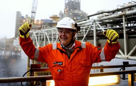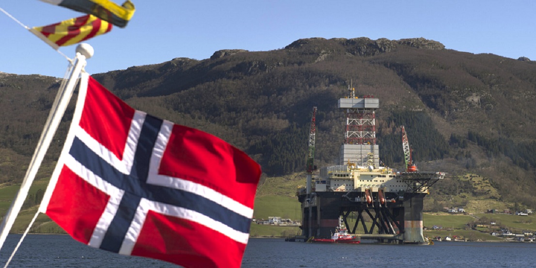 A Norwegian national flag flies from a vessel near the Scarabeo 8 deepwater oil drilling rig, operated by ENI Norge AS, in Olensvag, Norway