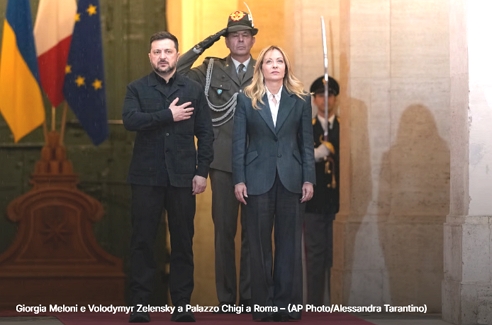 Le note dell’inno ucraino risuonano fino ai portici di Piazza Colonna, dove i giornalisti sono assiepati per sfuggire alla pioggia battente. Il convoglio che porta Volodymyr Zelensky a Palazzo Chigi blocca la viabilità nella già ingolfata Piazza Venezia e i romani alla guida sono nervosi.