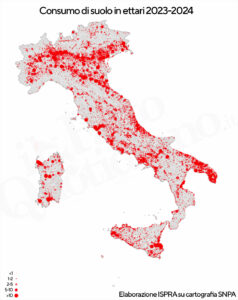 Ispra ricorda la legge Ue sul ripristino della natura (contro cui ha votato l’Italia) – Da qui il monito di Ispra: “Il consumo di suolo in Italia è un fenomeno in accelerazione che richiede risposte urgenti e coordinate. La sfida è duplice: da un lato, contenere l’espansione urbana e infrastrutturale e dall’altro, promuovere il ripristino ecologico e la resilienza territoriale”. In particolare, ricorda sempre l’istituto, “il regolamento europeo sul ripristino della natura impone l’azzeramento della perdita netta di aree verdi urbane entro il 2030 e il loro incremento dal 2031”. Si parla del regolamento approvato in via definitiva dall’Unione europea il 17 giugno 2024, con il voto contrario proprio dell’Italia che, però, deve elaborare e presentare un piano di ripristino e non ha neppure una legge nazionale unica sul consumo di suolo. Il Parlamento europeo, però, ha approvato il 23 ottobre 2025 la prima Direttiva sul suolo, che definisce un quadro comune per monitorarne la salute e contrastarne il degrado.