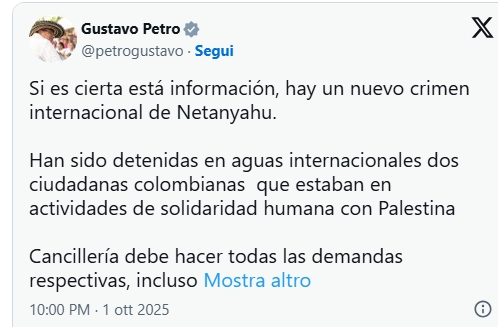 Il presidente colombiano, Gustavo Petro, ha chiesto l’espulsione del corpo diplomatico israeliano dalla Colombia, dopo l’arresto di due cittadine colombiane in acque internazionali, Manuela Bedoya e Luna Barreto, che stavano svolgendo attività umanitarie a favore della popolazione di Gaza, a bordo della Flottiglia Globale Sumud.