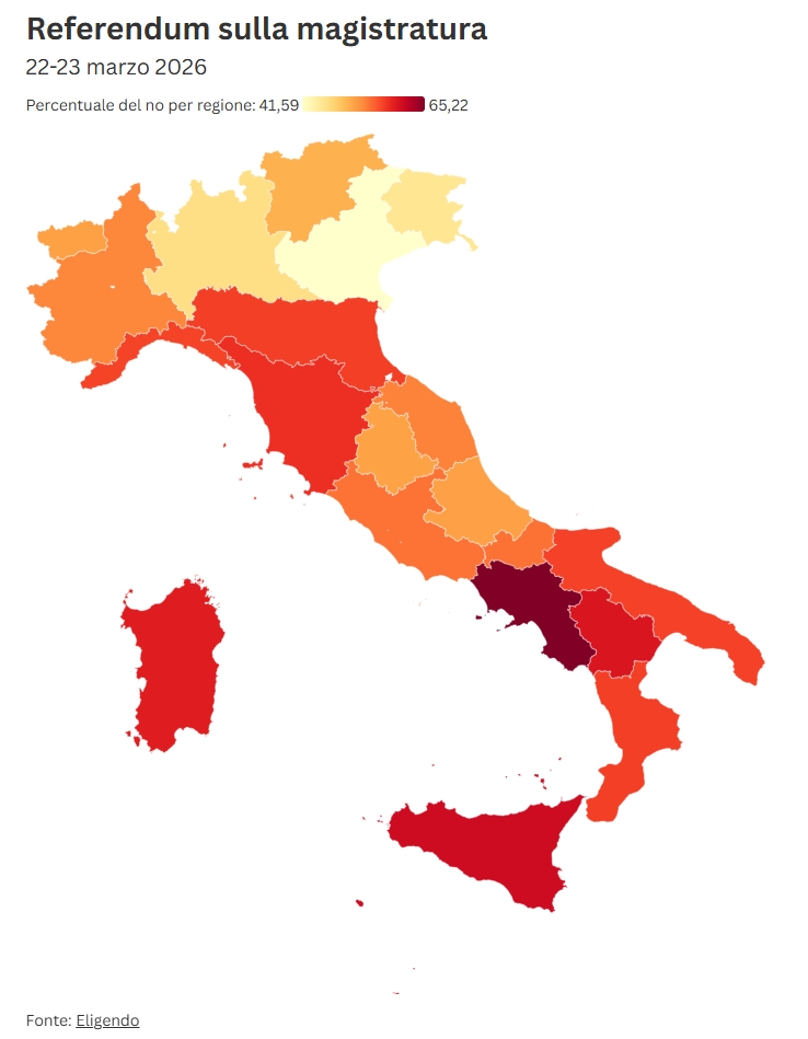 IL VOTO che non doveva essere politicizzato si è invece tramutato nella prima sconfitta della maggioranza. Confermata peraltro da un’affluenza inattesa che ha sfiorato il 60%. Si tratta della seconda maggiore affluenza per un referendum confermativo dal 1946 a oggi. Gli elettori hanno superato anche quelli delle Europee del 2024, dove non si arrivò al 50% degli aventi diritto. Merntre alle scorse elezioni politiche l’affluenza raggiunse il 63,91%. In questo caso, per la precisione, è stata del 58,93% con punte superiori al 65% in Umbria, Emilia Romagna (66,97) e Toscana (66,27). Al fondo della classifica dei votanti Calabria, Sicilia e Basilicata ma con numeri sorprendenti: al sud il distacco tra le due posizioni è stato molto più marcato. In Basilicata il No ha vinto con il 60,03% contro il 39,97 del Sì. In Sicilia 60,98% contro il 39,02 e in Calabria 57,23 rispetto al 42,77% del Sì. Tutte e tre le regioni sono governate dal centrodestra. Menzione speciale per la Campania dove due elettori su tre hanno bocciato la riforma Nordio-Meloni (65,23%). Emblematico il caso di Napoli dove il No si è affermato con il 75,49%, il record.