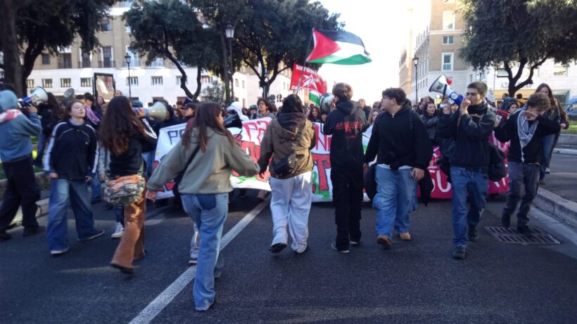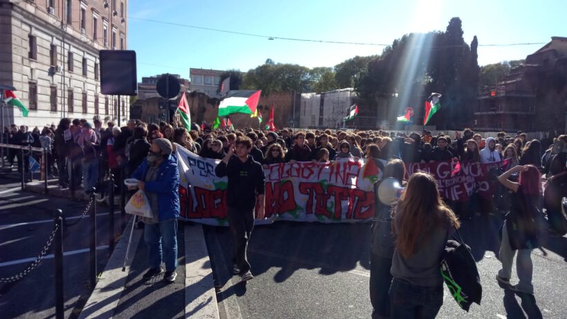 In testa lo striscione dell’Equipaggio di Terra contro l’economia di guerra. Stop genocide, mentre uno striscione di militanti invoca: “Mai più scioperi separati”. Tantissimi gli studenti delle scuole medie superiori, tra cui gli aderenti alla Rete della Conoscenza e ai collettivi autonomi, tante bandiere palestinesi e curde.