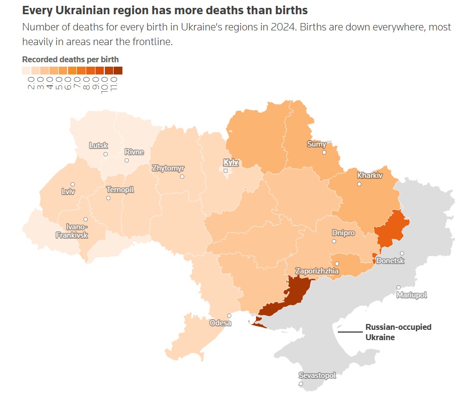 Secondo l’istituto demografico dell’Accademia nazionale delle scienze dell’Ucraina, la popolazione del paese, che prima dell’invasione era di 42 milioni (già in netto calo rispetto ai decenni precedenti), si è ridotta a meno di 36; ma questa cifra comprende alcuni milioni di persone che vivono nelle regioni ormai conquistate e annesse da Mosca. Si stima che entro il 2051 la popolazione possa scendere a soli 25 milioni.