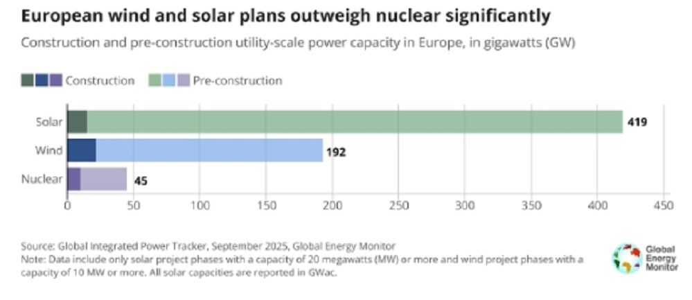 Eppure sul fronte opposto, ci sono oltre 600 GW di eolico e solare in pre-costruzione o costruzione in Europa. Cioè una scala di progetti quattordici volte superiore ai 9,3 GW di nuova capacità nucleare in costruzione (di cui la maggior parte è destinata a sostituire le unità in via di dismissione piuttosto che a espandere la capacità totale). Questi numeri non sono meri dettagli tecnici: definiscono la geografia degli investimenti e la finestra temporale in cui gli investimenti producono ritorni. Perché la gran parte di questa nuova capacità rinnovabile sarà operativa molto prima dei reattori atomici in cantiere. Per solare ed eolico i tempi medi di realizzazione – nonostante iter autorizzativi spesso ostacolati dalla burocrazia – variano da uno a quattro anni. Contro i dieci o più richiesti per una centrale nucleare.