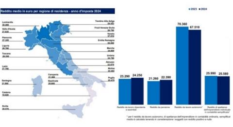 Nel complesso il reddito dichiarato l’anno scorso è ammontato a 1.076,3 miliardi di euro (+4,7% rispetto al 2023). Gli autonomi che sono rimasti nella tassazione ordinaria hanno dichiarato lo scorso anno una media di 67.510 euro, in calo del 4,1% dagli oltre 70mila dell’anno prima. Quasi il triplo rispetto ai 24.520 euro dei lavoratori dipendenti, saliti della stessa percentuale – dai 23.290 euro dell’anno prima – per effetto dell’aumento degli occupati sia a tempo indeterminato (+1,6%) sia a termine (+1,1%). Anche se va considerato che la differenza è in parte spiegata dal fatto che i redditi da lavoro autonomo sono al lordo dei contributi. I pensionati si fermano invece a 22.390 euro, +5,3% sul reddito 2023. Ma le medie, come è noto, dicono poco sulla distribuzione. Qualcosa in più dicono le mediane, cioè i valori “centrali” che dividono a metà il campione (il 50% guadagna di meno e il 50% di più): per gli autonomi la mediana è di 41mila euro, segno che pochi redditi elevati spingono verso l’alto la media, mentre per i dipendenti è poco sotto i 22mila euro, segno di una maggiore uniformità. A livello territoriale la regione con reddito medio complessivo più elevato è ancora la Lombardia (30.200 euro), seguita dal Trentino Alto Adige (28.553 euro, con la provincia di Bolzano che raggiunge i 29.850 euro), mentre in coda c’è ancora una volta la Calabria (19.020 euro).