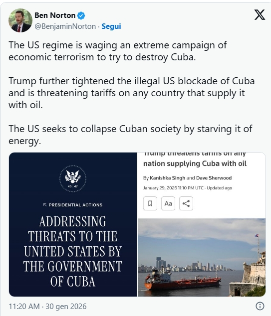 Il presidente cubano Miguel Díaz-Canel ha definito "fascista, criminale e genocida" la nuova escalation dell'amministrazione Trump contro l'isola, dopo la firma di un ordine esecutivo che minaccia dazi del 30% sui beni provenienti da paesi che vendano o forniscano petrolio a Cuba. Per il leader caraibico, si tratta dell'ennesima mossa di una "cricca" che ha "dirottato gli interessi del popolo statunitense per fini puramente personali", con l'obiettivo dichiarato di strangolare l'economia nazionale sotto il pretesto infondato che l'isola rappresenti una "minaccia insolita e straordinaria" alla sicurezza nazionale statunitense.
