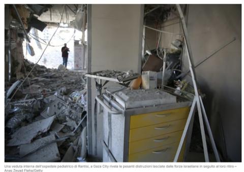 IN DIVERSE AREE di Gaza City non c’è ancora linea per i cellulari e si deve camminare a lungo per trovare una connessione. Manca anche l’elettricità e l’unico modo per ricaricare i cellulari è recarsi in uno degli ospedali ancora operativi. Ma alcune delle strutture sanitarie sono state completamente distrutte. I medici e il personale dell’ospedale pediatrico al-Rantisi sono rientrati nella città di Gaza con la speranza di poter riprendere servizio. Erano stati costretti a evacuare dagli attacchi dei militari, che hanno colpito più volte i piani alti dell’edificio quando i pazienti erano ancora all’interno. Il ministero della salute ha diffuso un video che mostra la struttura sventrata. Anche le sale interne sono state fatte a pezzi, così come i lettini dei bambini, i macchinari medici. Rimane solo uno scheletro inutilizzabile.